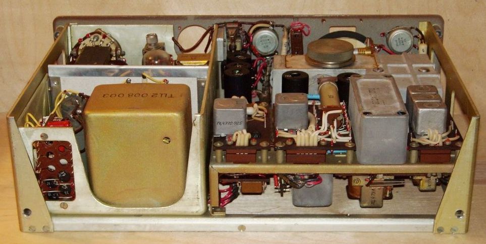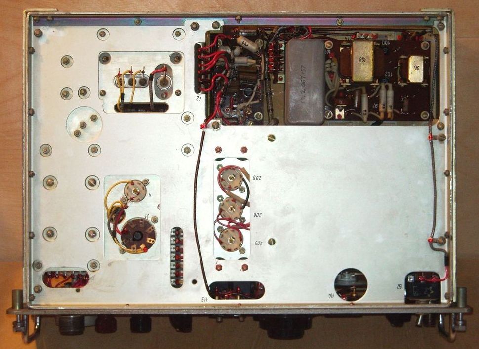 “R-375” (Kaira) – army VHF (MV / DMV) radio receiver. On the front panel, on the left, there is a two-speed vernier device with a photoscale of the MV range of 20-210 MHz, and on the right is the same UHF range of 210-500 MHz. Two antenna inputs – MV and UHF. There is an IF output of 4 MHz, a broadband (up to 400 KHz) low frequency output and an output to the TLF 0.3-2.5 KHz.